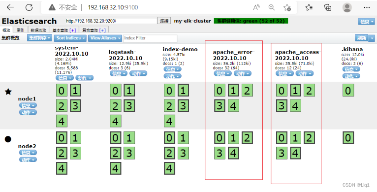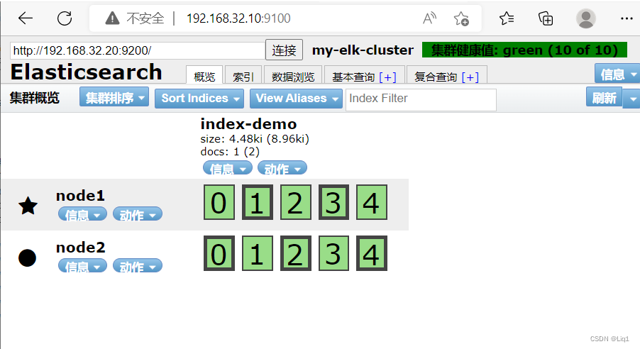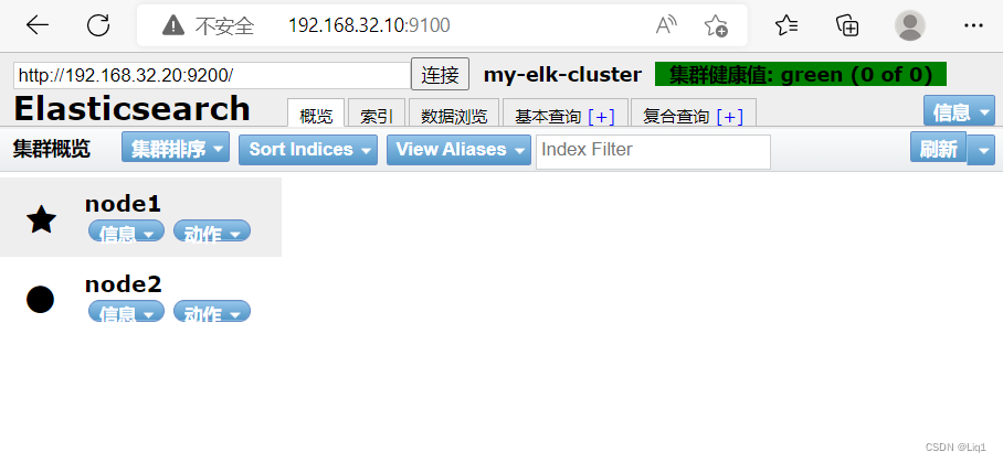 打开浏览器 输入http://192.168.32.10:9100/ 查看索引信息###