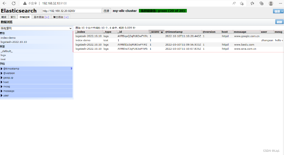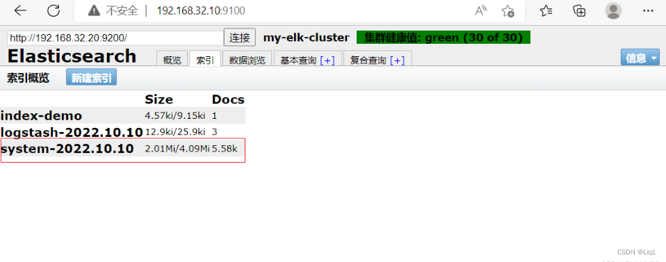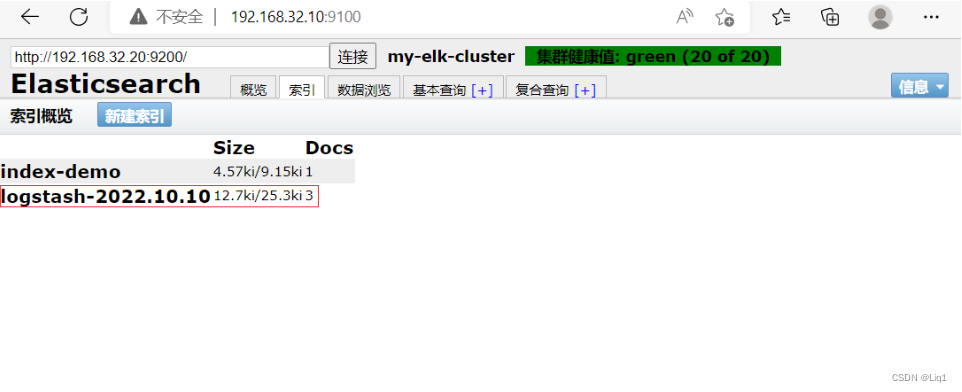 打开浏览器 输入http://192.168.32.10:9100/ 查看索引信息