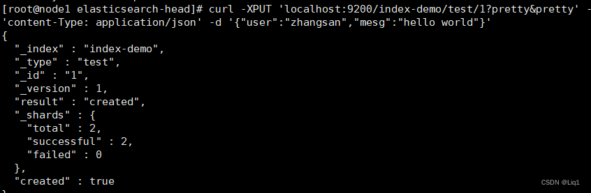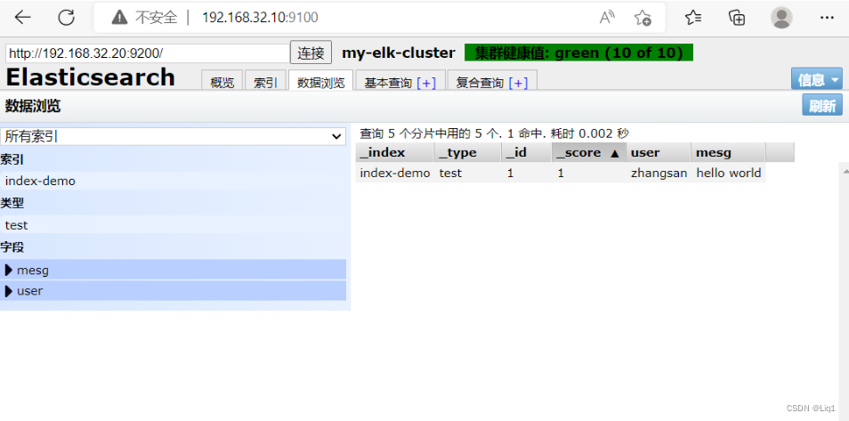 点击数据浏览–会发现在node1上创建的索引为index-demo,类型为test, 相关的信息