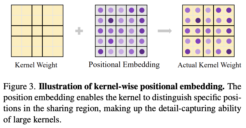 为了解决这个问题,我们提出了基于内核的位置嵌入。形式上,给定一组输入特征 𝑋 ,我们通过与内核权重 w ∈ ℝ 𝑐 in × 𝑐 out × k × k 的卷积来处理这些特征。我们使用 trunc normal [53] 初始化来初始化嵌入 h ∈ ℝ 𝑐 in × k × k 的位置。
