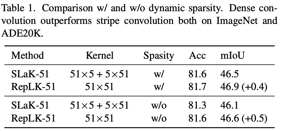 SLaK 介绍了将内核扩展为 51 × 51 的两步方法:1)将大内核分解为两个矩形、平行的内核; 2)使用动态稀疏性并扩展更多宽度。为了彻底分析卷积形式的效果,我们进行了带稀疏性和不带稀疏性的实验。默认情况下,我们重新参数化 5 × 5 卷积以缓解 SLaK 和 RepLKNet 所采取的优化问题。表1的结果表明,无论动态稀疏性如何,密集网格卷积都超过了条带卷积。