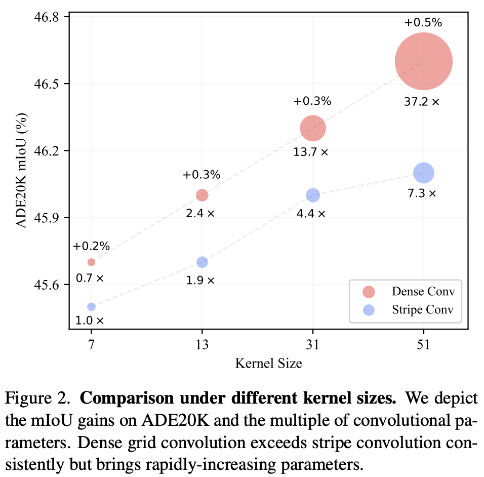我们进一步探索不同内核大小下的卷积形式(即 K × K 与 K × N)。具体来说,我们将 SLaK 的 stripe conv 的短边固定为 5 作为默认设置(N=5),然后逐渐将 K 从 51 减少到 7。我们不使用动态稀疏性来对卷积形式进行纯粹的消融。如图2所示,密集网格卷积在多个内核尺寸下始终优于条带卷积,并且增益随着内核尺寸的增加而增加,展示了密集网格大内核卷积的本质优势。