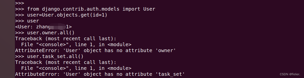 此外还有个需要注意的地方,如果我们想禁止这种反向引用的访问方法,可以设置related_name="+",例如上方Task模型的owner字段就使用该方法,我们尝试访问下来验证是否如此。