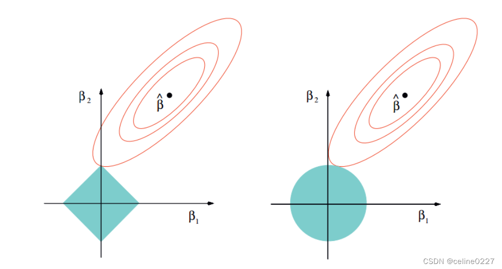 如上图所示,两个图是对应于两种方法的等高线与约束域。红色的椭圆代表的是随着λ的变化所得到的残差平方和,βˆ为椭圆的中心点,为对应普通线性模型的最小二乘估计。左右两个图的区别在于约束域,即对应的蓝色区域。
