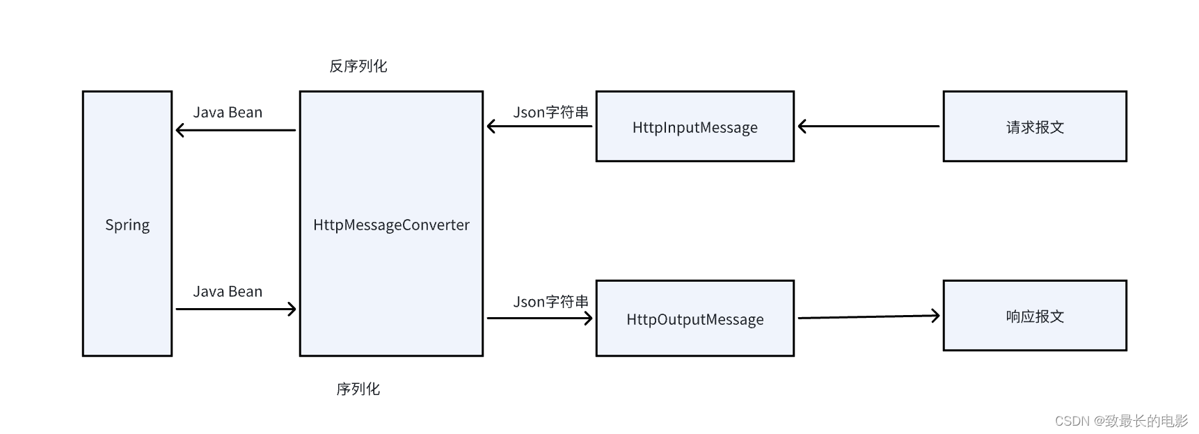 前端发来请求后,先调用 HttpInputMessage 从输入流中获取 Json 字符串,然后在 HttpMessageConverter 中把 Json 转换为接口需要的形参类型。