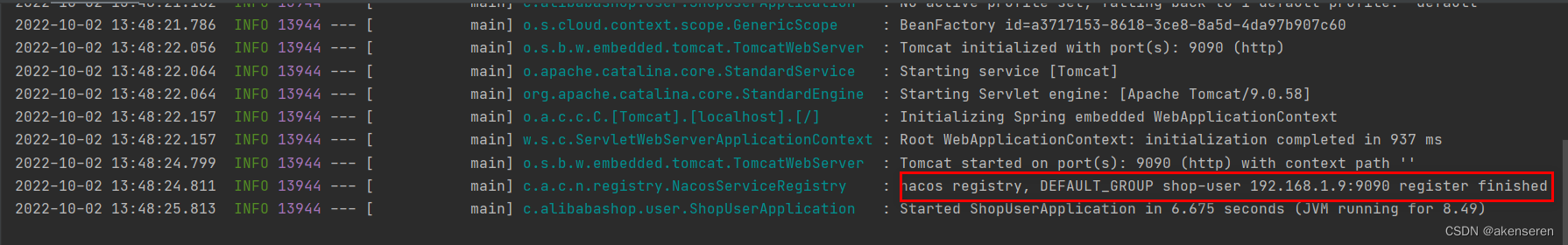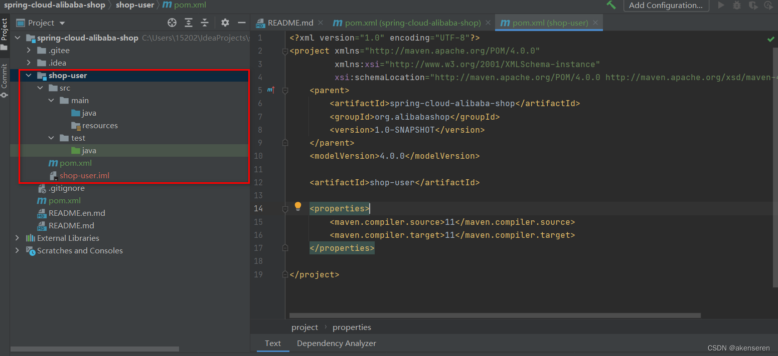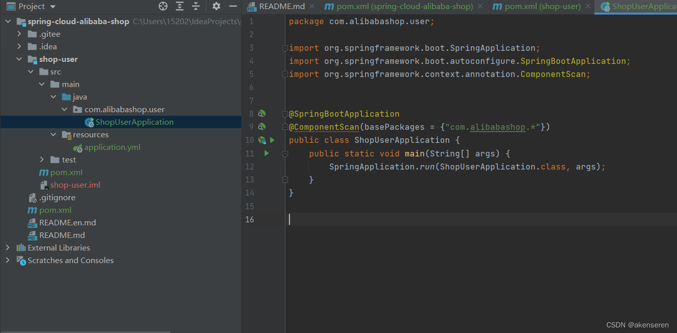 至此,本文搭建springcloud alibaba项目工作就完成了。在本项目的第一阶段,通过在项目中新建一个shop-user的子模块,并引入nacos的配置项,将其作为项目的注册中心和参数配置中心,同时简单了解了nacos在项目开发中的作用。下一篇我们将介绍 springcloud alibaba中另一个组件openfegin的使用。