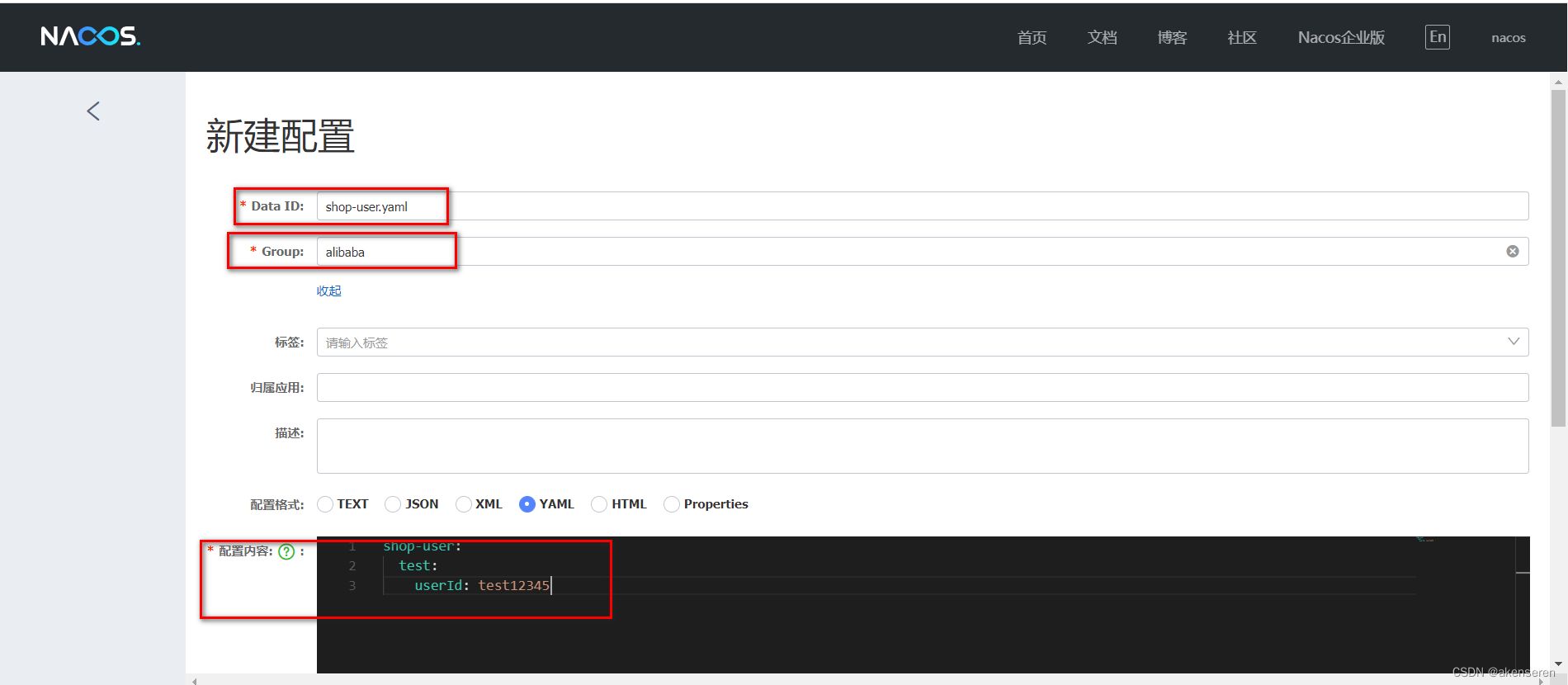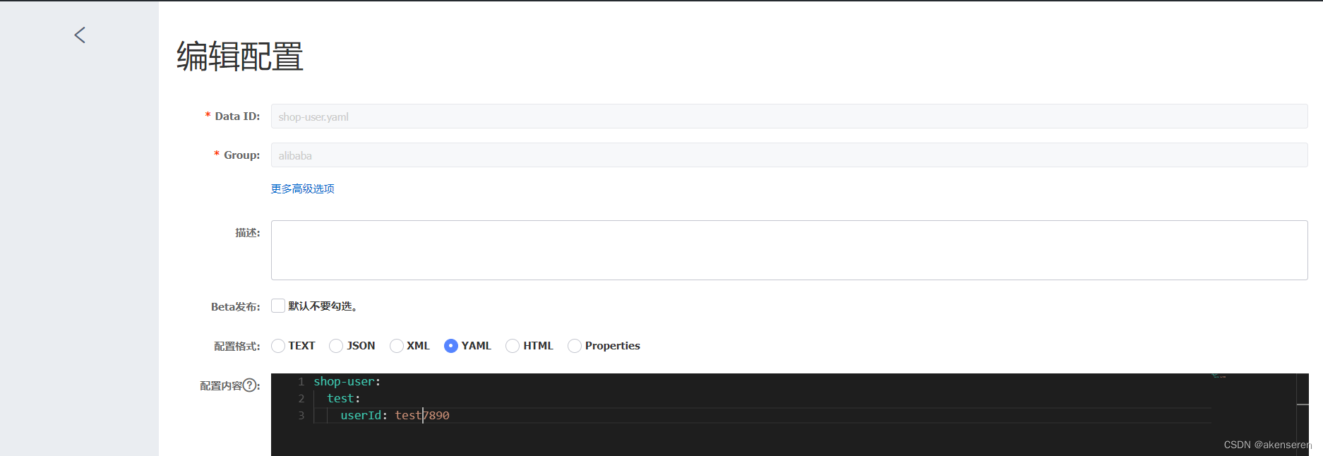 dataId和group要和配置文件对应,我们增加一个测试配置,然后发布.