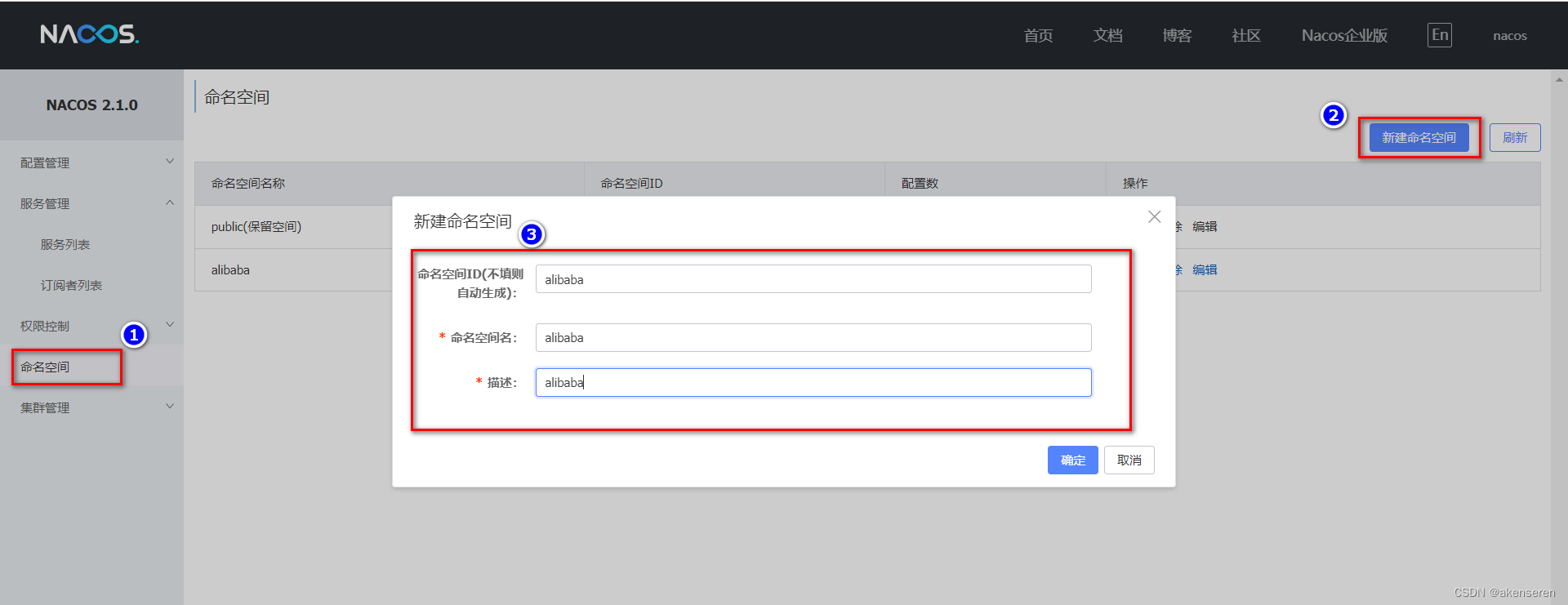 新建一个命名空间(与上文的配置一样,alibaba),可以将服务注册到这个命名空间下,这样方便方便在多人写作团队进行管理: