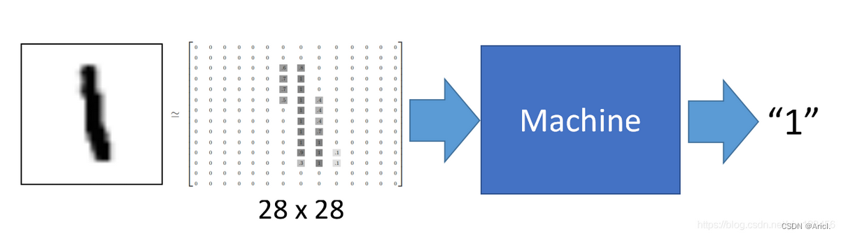 采用的数据集是MNIST数据集。在该数据集中每张图片由28x28个像素点构成,每个像素点用一个灰度值表示。如下是数字1的一个例子,我们的目的是做出一个模型,将这784个数值输入这个模型,然后它的输出结果就为1。