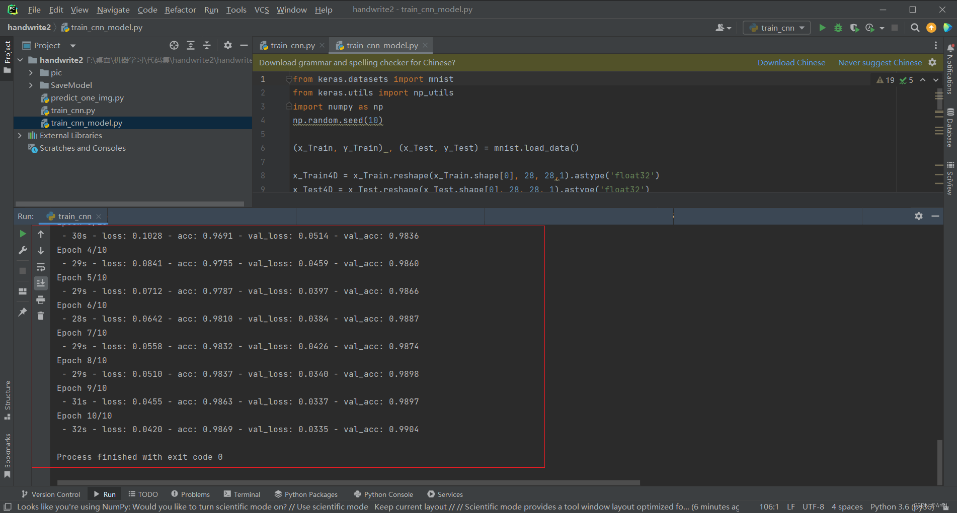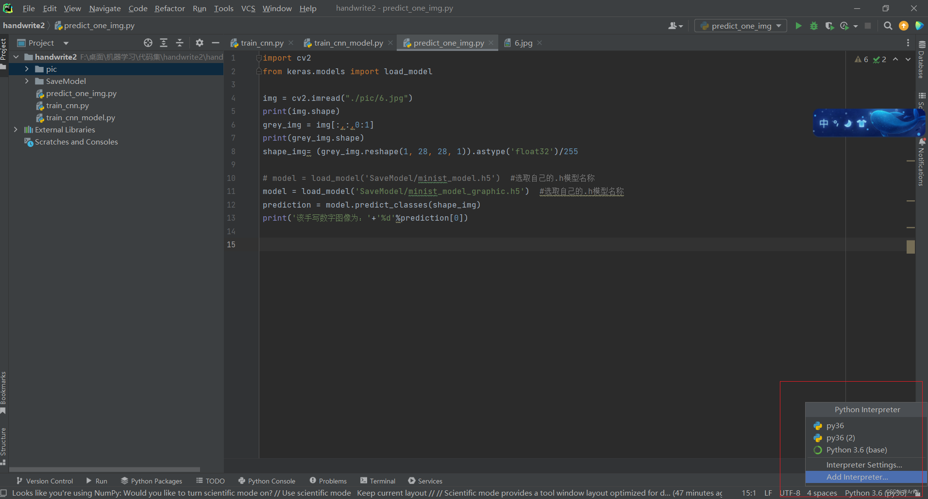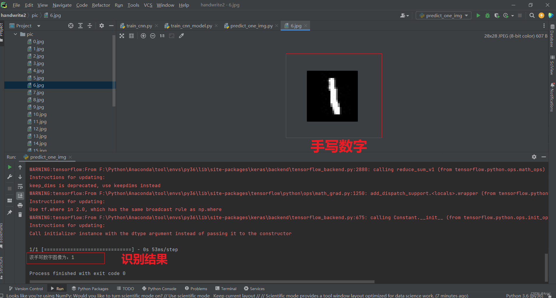 本次通过基于Keras手写数字图像识别这一经典案例,初步学习了机器学习中另一个重要的分支领域——深度学习的内容,采用的数据集是MNIST数据集。在该数据集中每张图片由28x28个像素点构成,每个像素点用一个灰度值表示。首先是要使用pip命令行下载程序所要导入的工具包,同时使用activate py36 指令将python环境切换到我们创建并导入相关工具包的环境下,编译器采用pycharm,将程序跑起来。首先要进行数据集的训练,然后再用训练好的模型去识别6.jpg这个手写数字图像,控制台打印出识别的结果。