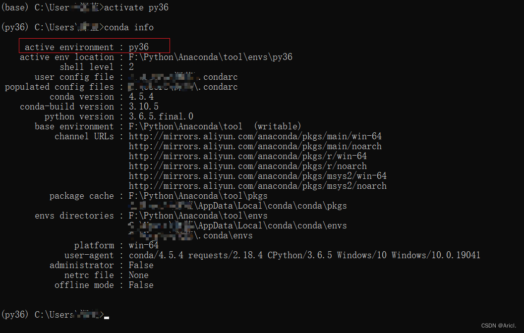 切换到py36环境后,输入conda info 命令,出现如下信息即表面环境创建成功!