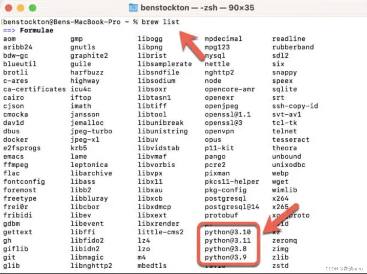 这将列出你之前通过Homebrew安装的任何已安装软件包(例如,python@3.11代表Python 3.11),如下图所示: