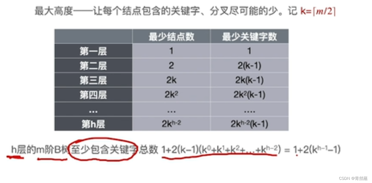 2路归并的“归并树”——倒立的二叉树,树高h,归并排序趟数m = h-1,第h层最多2^(h-1)个结点,则满足n ≤ 2^(h-1),即h-1 = ⌈log₂n⌉; 结论: n个元素进行2路归并排序,归并趟数 m = ⌈log₂n⌉