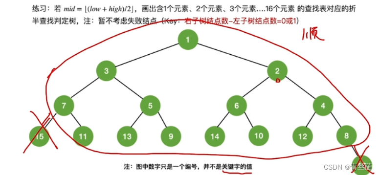 2路归并的“归并树”——倒立的二叉树,树高h,归并排序趟数m = h-1,第h层最多2^(h-1)个结点,则满足n ≤ 2^(h-1),即h-1 = ⌈log₂n⌉;一般情况下,算法中基本操作重复执行的次数是问题规模n的某个函数f(n),算法的时间量度记作T(n)=O(n),它表示随问题规模n的增大而增大,算法执行时间的增长率和f(n)的增长率相同,称作算法的渐近时间复杂度,简称时间复杂度。根据单