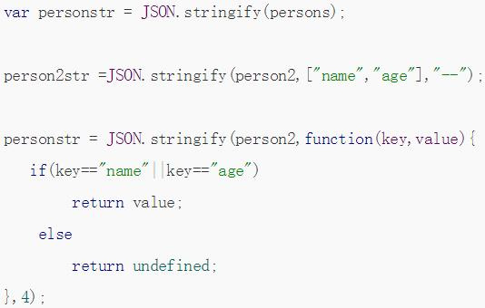 JSON.stringify函数第二个参数是过滤器,表示只保留name和age两个属性,也可以以函数作为过滤器。第三个参数是换行缩进,可为数字缩进空格数目,最大缩进为10,可为字符串,表示缩进字符串。