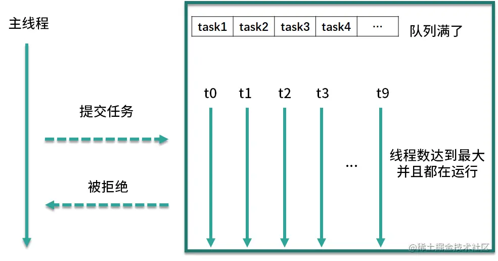 - 如果依然有任务被提交,这就超过了线程池的最大处理能力,这个时候线程池就会拒绝这些任务