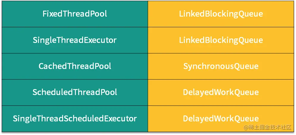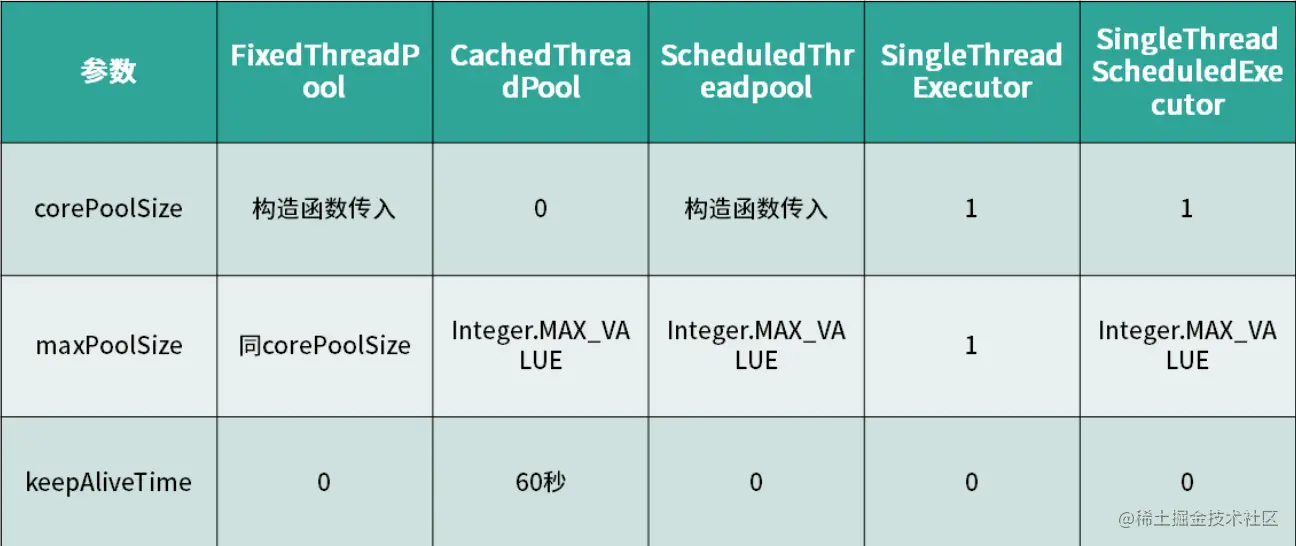 总结上述的五种线程池,我们以核心线程数、最大线程数,以及线程存活时间三个维度进行对比,如表格所示