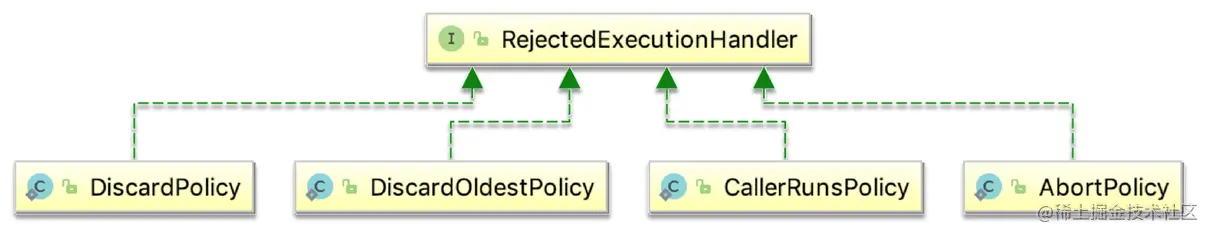 Java 在 ThreadPoolExecutor 类中为我们提供了 4 种默认的拒绝策略来应对不同的场景,都实现了 RejectedExecutionHandler 接口,如图所示: