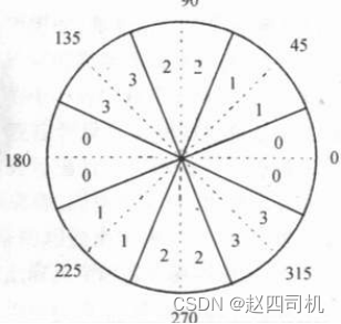 * 将梯度角离散为圆周的四个扇区之一,以便用3×3的窗口作抑制运算