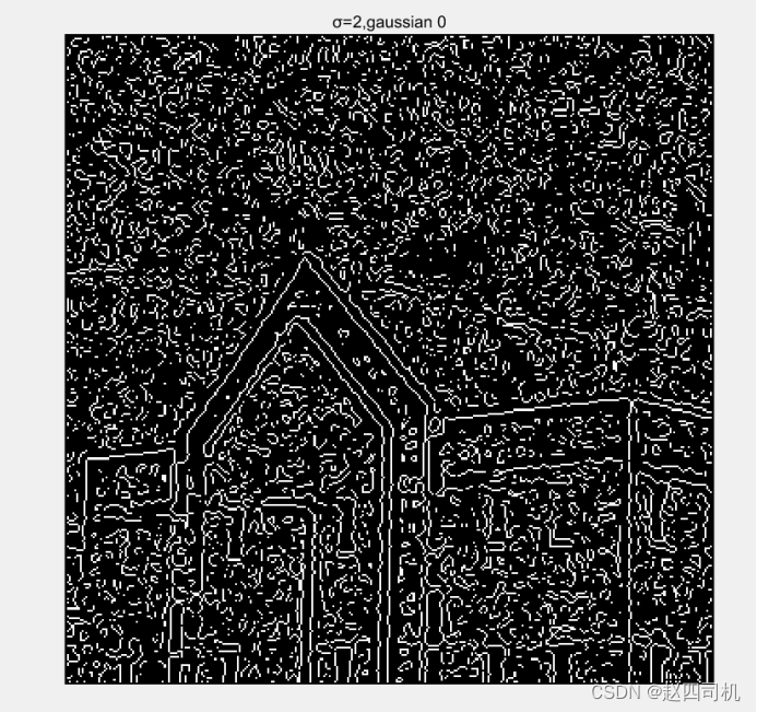 LoG算子将高斯滤波和拉普拉斯边缘检测结合在一起,首先用高斯函数先进行低通滤波,然后利用拉普拉斯算子进行高通滤波并提取零交叉点。可以看到处理结果的图像边缘较平滑(见图3.4-1),是因为LoG算子不能检测边缘方向。而且在加入噪声之后,可以看到LoG算子对噪声十分敏感(见图3.4-3),不断调整参数,最终在参数THRESH=0.012,Sigma=2时得到较好的结果(见图3.4-5),但是还是损失了很多边缘信息。