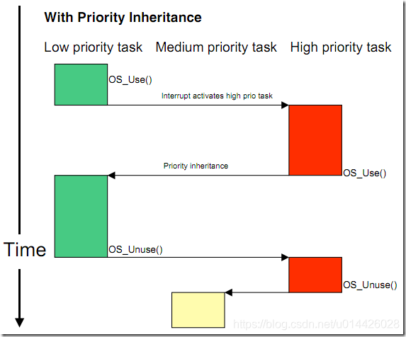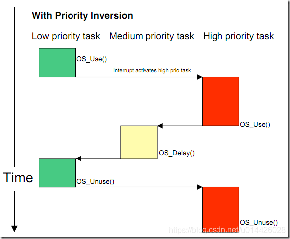 此高优先级的任务A,必须等到低优先级任务C,把其所占用的资源释放掉后,才能继续运行。