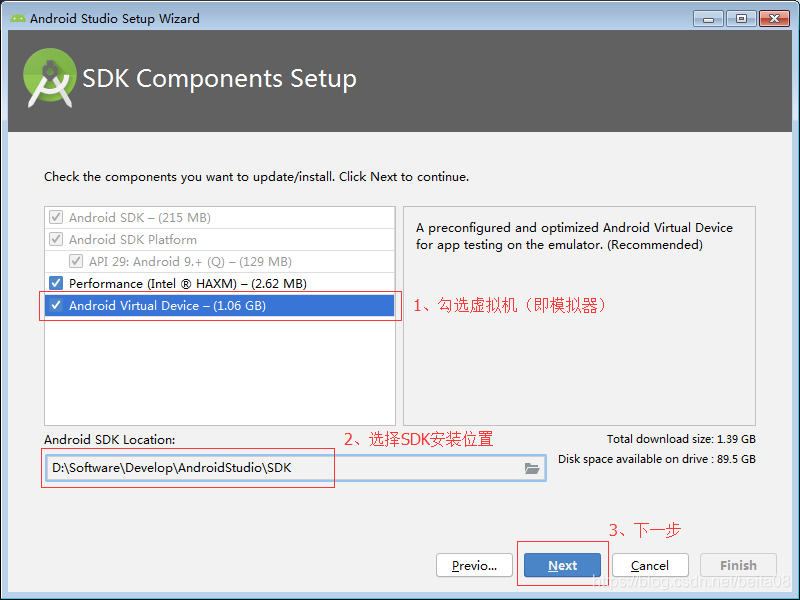18、选择SDK的安装位置(如果不需要模拟器也可以取消 Android Virtual Device 勾选):