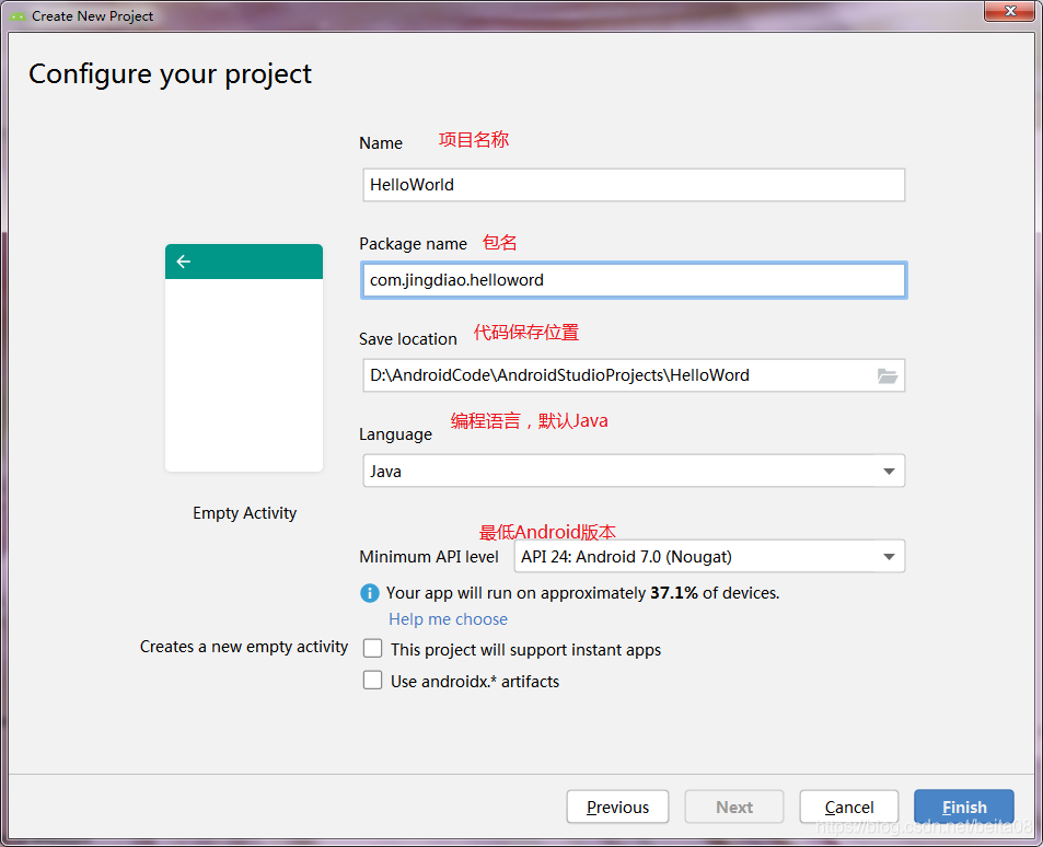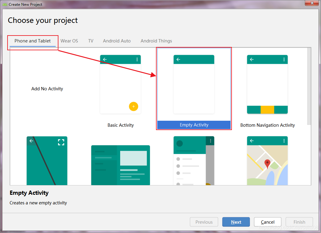 2、默认选择“Empty Activity”,表示项目包含一个空的Activity,然后点击“Next”按钮: