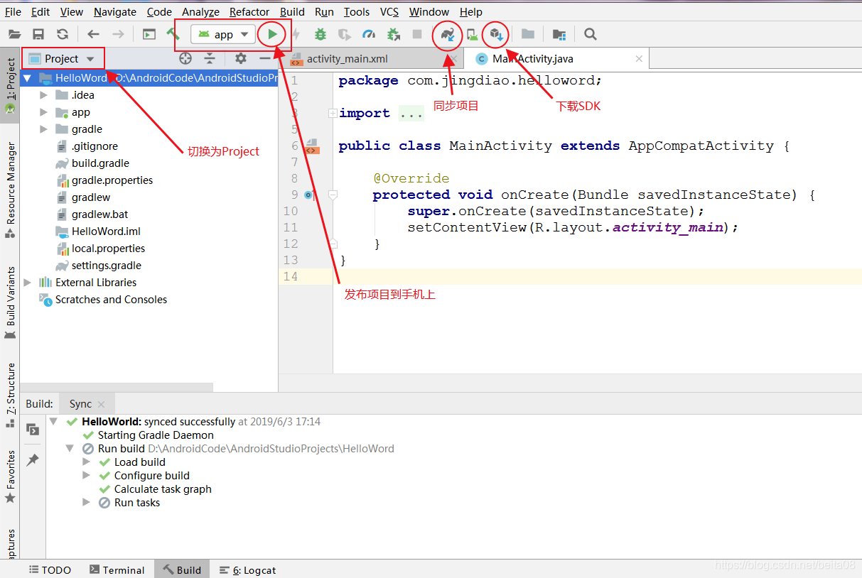5、编译成功后,界面上的几个重要功能如下图所示,其中点击app后面的“Run”按钮即可将项目发布到终端上: