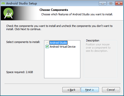 5、选择要安装的组件,默认下一步即可(如果不需要模拟器也可以取消 Android Virtual Device 勾选):