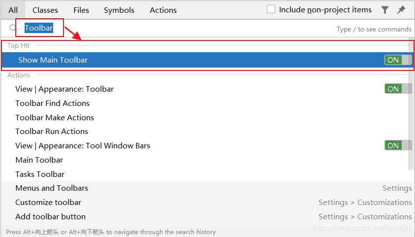 6、如果Android Studio界面上没有上图所示按钮,双击键盘Shift,在弹出的文件搜索框搜索Toolbar,然后打开“Show Main Toolbar”开关即可: