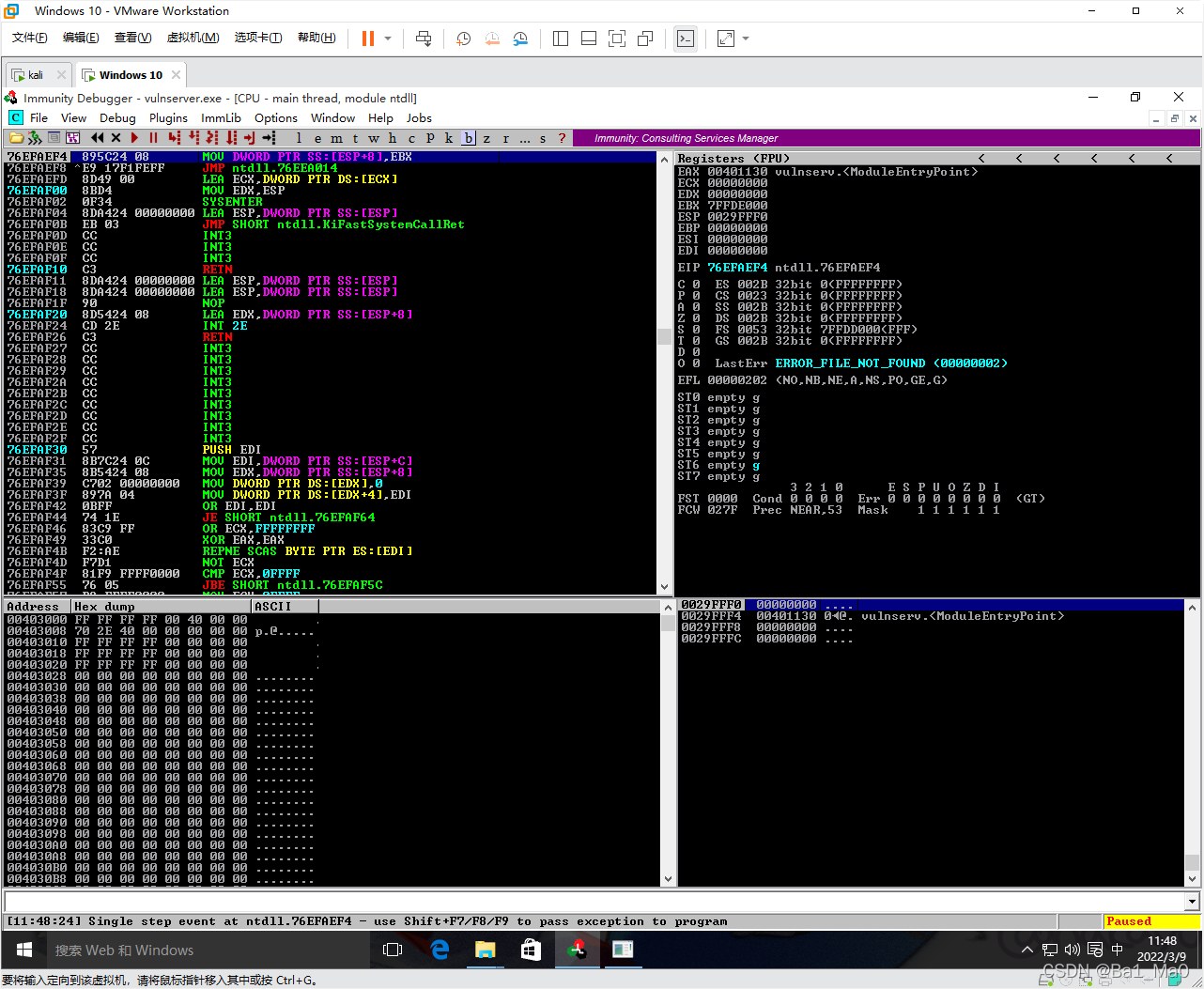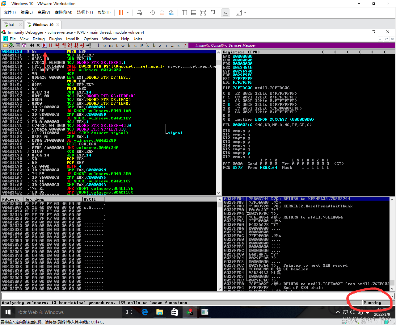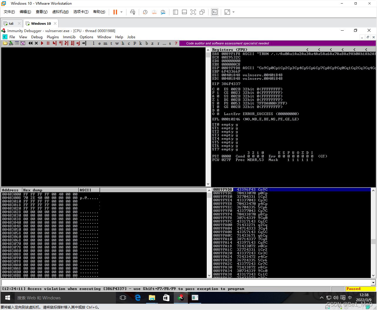 然后去到windows上,将immunity debugger关闭再双击打开,然后将Vulnserver.EXE拖入immunity debugger,然后双击开始运行,重复一次上面的操作,因为程序崩溃了,要重新运行才行