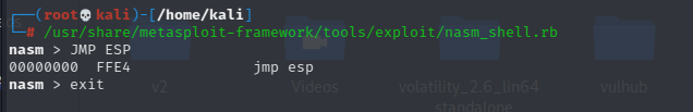 在汇编语言里,有一个指令叫做jmp,它能跳转到指定的地址,我们可以把EIP的值换成jmp指令存在的地址,然后跳到我们想要执行代码的地方,有一个重要的寄存器叫做ESP,它存放的参数是程序空间最大的地址,回到kali,用metasploit将jmp和ESP的操作码找到
