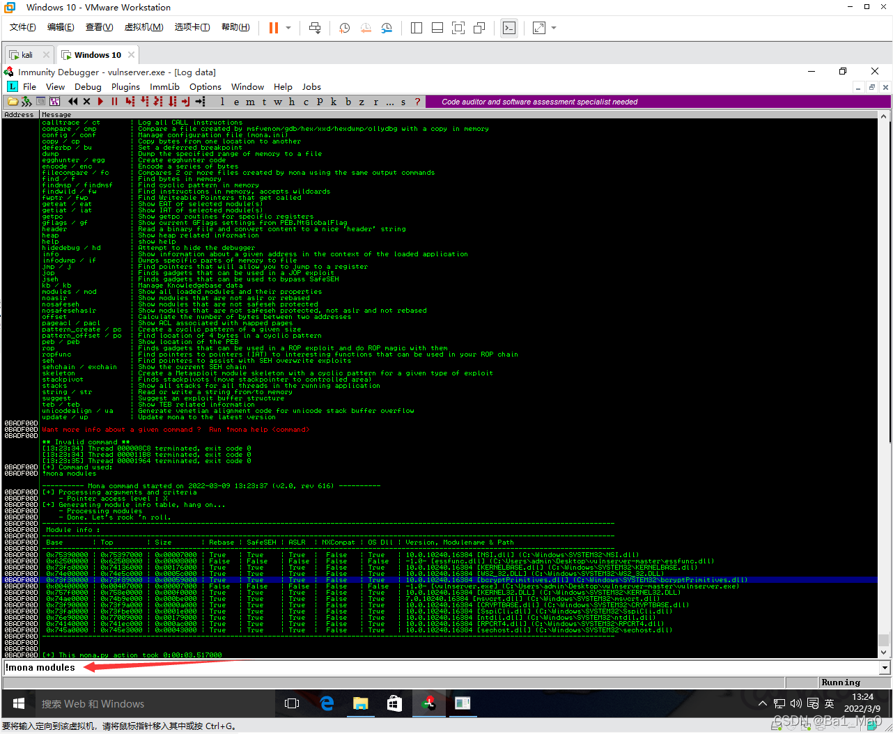 然后将mona.py放到\Immunity Debugger\PyCommands下,然后将immunity debugger关闭再双击打开,然后将Vulnserver.EXE拖入immunity debugger,然后双击开始运行,重复一次上面的操作,因为程序崩溃了,要重新运行才行