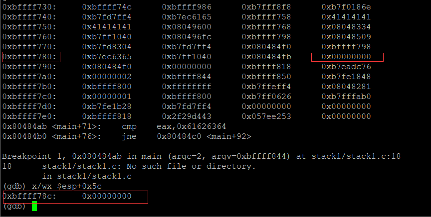 esp+0x5c地址就是栈里的0xbffff78c,每一段存放四个字符,c代表的是12