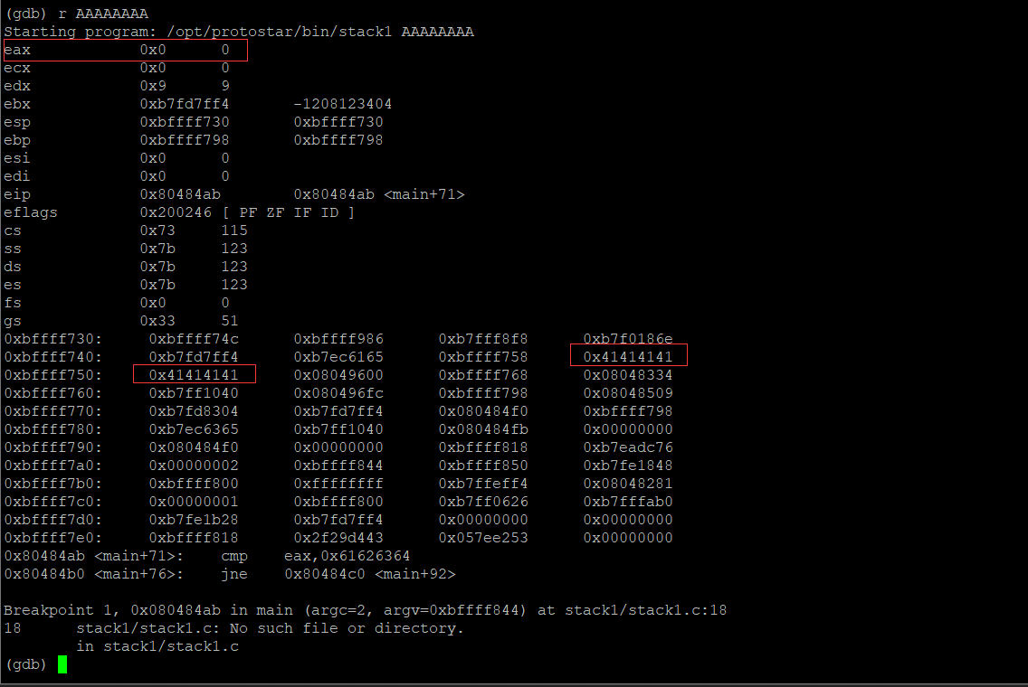 程序执行到我们设置的断点处自动执行了我们上面设置的命令,在这里可以看到我们输入的8个大写A在栈中的位置,并且eax寄存器里的值为0
