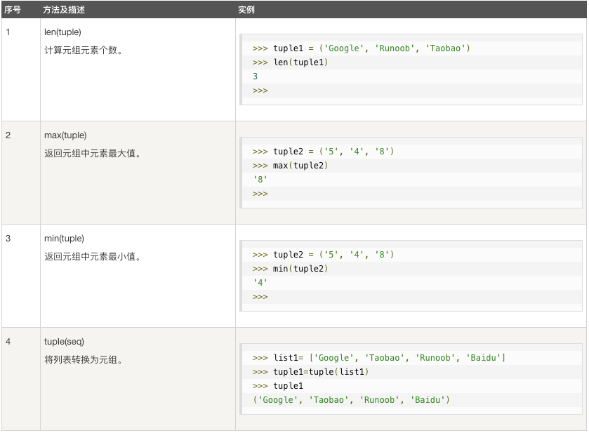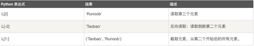 >>> L = ('Google', 'Taobao', 'Runoob') >>> L[2] 'Runoob' >>> L[-2] 'Taobao' >>> L[1:] ('Taobao', 'Runoob') t = ('a','b','c','d','e','f') print(t[1::-1]) # ('b', 'a') 索引 从 1 到 0 print(t[-1:-7:-1]) # ('f', 'e', 'd', 'c', 'b', 'a') 索引 从 -1 到 -7 print(t[5::-1]) # ('f', 'e', 'd', 'c', 'b', 'a') 索引 从 5 到 0 print(t[1:5:-1]) # () 结果为空 # 综上,tuple[start:end:step] 中 step:步长 ,end-start,步长为正时,从左向右取值。步长为负时,反向取值 # 即 step 为负 表示 从 start 往左开始 end 应比 start 小,如果 step 为正 表示 从start 往右开始,end 应比start 大。所以 t[1:5:-1] 为空