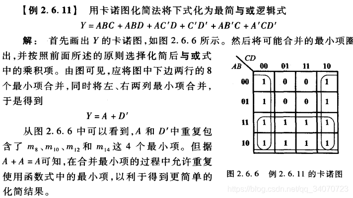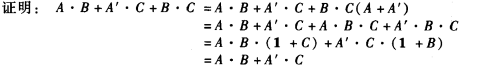 若两个乘积项中分别包含 A和A'两个因子,而这两个乘积项的其余因子组成第三个乘积项时, 则第三个乘积项是多余的, 可以消去。