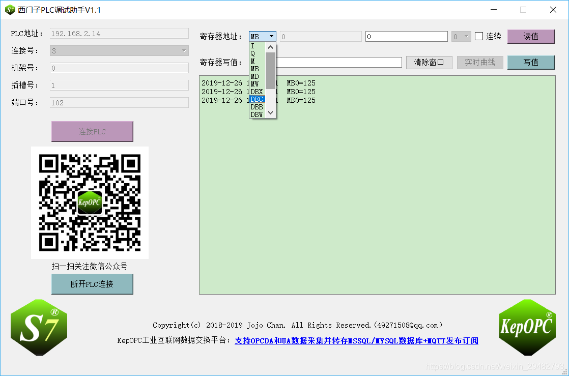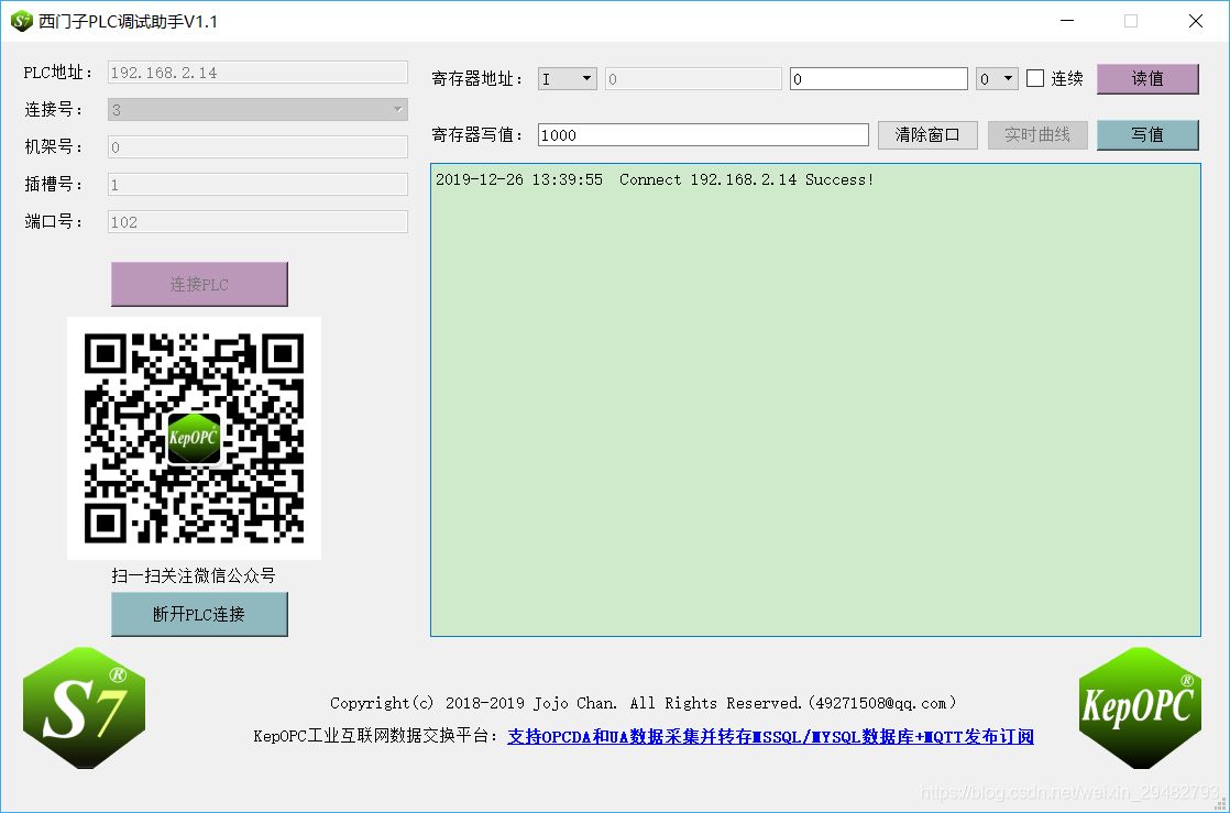 2019年12月26日更新:1、新增对S7 200smart的连接;2、新增连接号定义;3、新增V区(V\VB\VW\VD)的读写值。