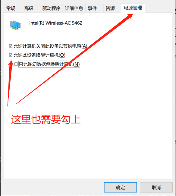 5. 在“电源管理”,勾选“允许计算机关闭此设备以节约电源”和“允许此设备唤醒计算机”,至于“只允许幻数据包唤醒计算机”,可以勾选也可以不勾选,毕竟我们WOL使用的就是幻数据包。