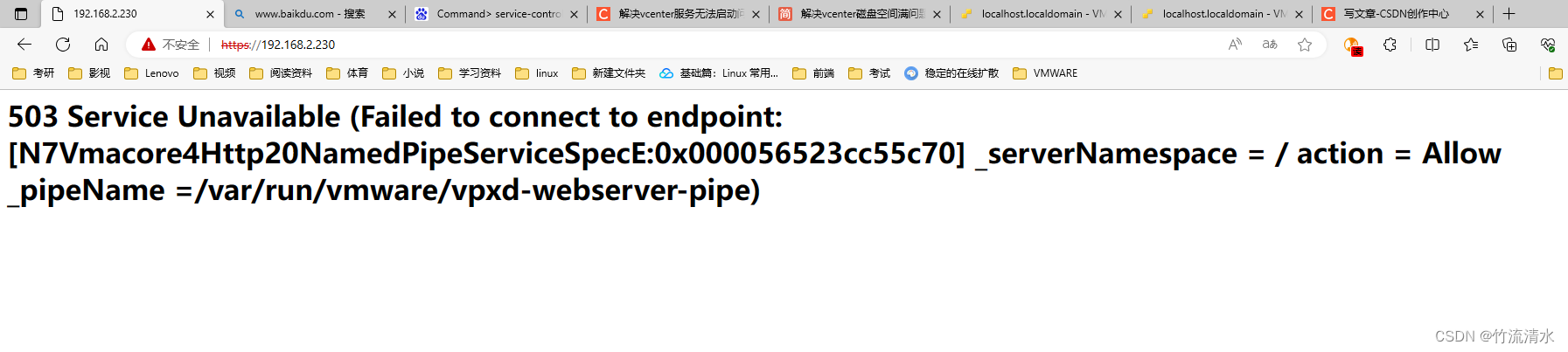 打开我们的服务器界面(虚拟机)报错:503服务器问题当前服务不可用。web服务器不能处理HTTP请求,可能是临时超载或者是服务器进行停机维护。错误提示是由 VMware vCenter Server(vCenter Servoer)引起的,表明 vCenter Server Web 服务无法连接到指定的管道端点。这可能会导致 Web 界面无法访问或出现问题。