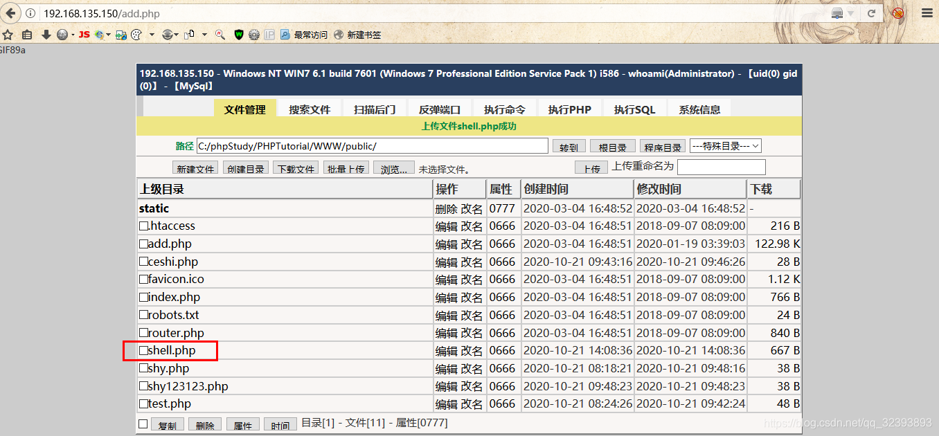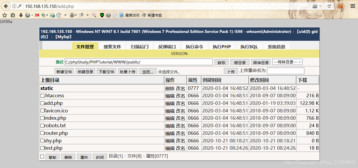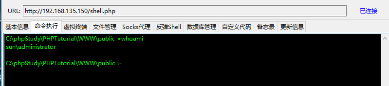 进入大马页面,根据大马进行测试,发现之前远程命令执行是可以写入成功的,只不过是我自己敲错了而已