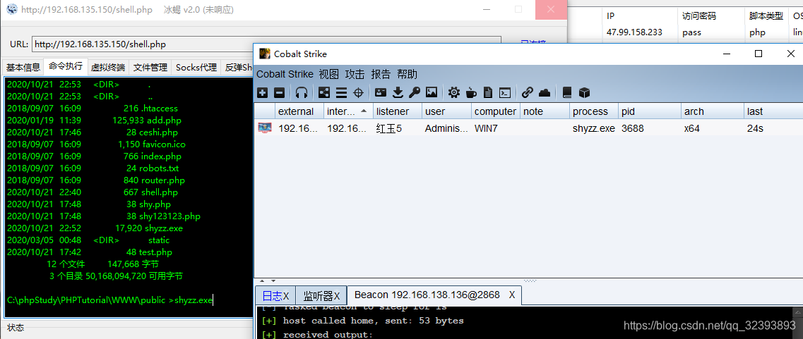 利用冰蝎生成木马shyzz.exe并上传到该网站进行cs上线