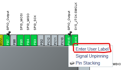 将PA15、PB7配置为GPIO_output模式,然后右击引脚分别重命名为LORA_NSS、LORA_RESET