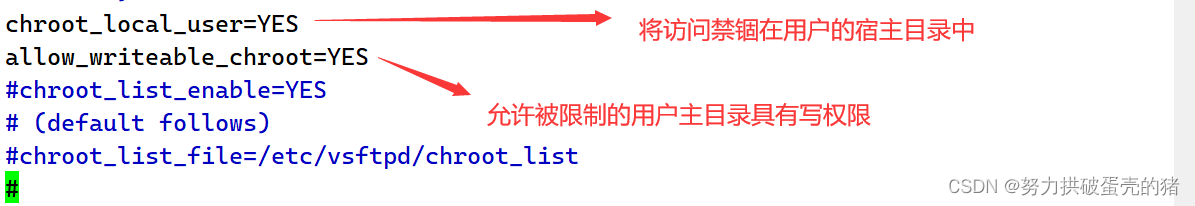 chroot_local_user=YES #将访问禁锢在用户的宿主目录中