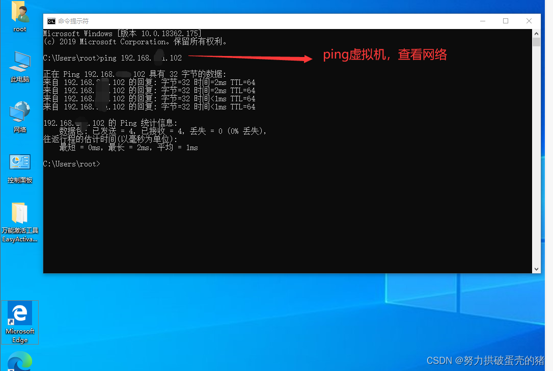 4.在另一台虚拟机,Windows系统打开 开始 菜单,输入 cmd 命令打开命令提示符,测试网络是否畅通,建立ftp连接