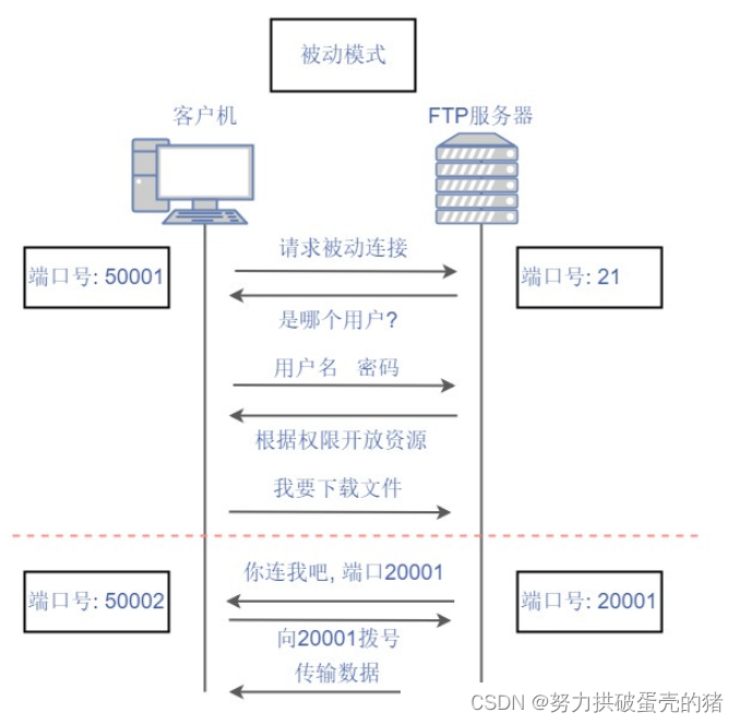被动模式传送数据是“客户端”连接到“服务器”的端口(服务端开启数据端口)。